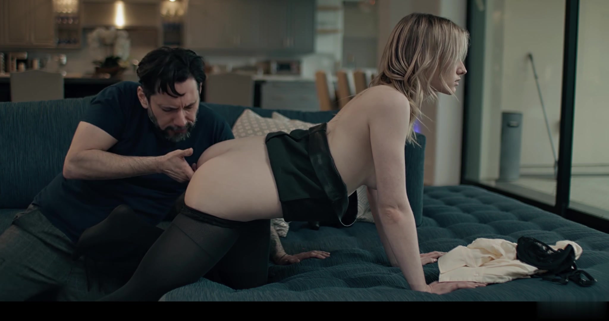 性感苗条的金发少女与哥哥一起看色情片